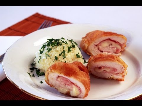 3. Két szelet sonkát és sajtot teszünk a húsokra, feltekerjük és hústűvel összetűzzük.